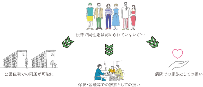 またパートナーシップ条例が導入された地域では、パートナーが怪我や病気で手術、入院をした際の付き添いや、家族向け住宅への入居などが可能とされています。